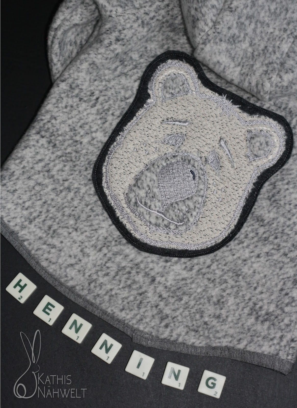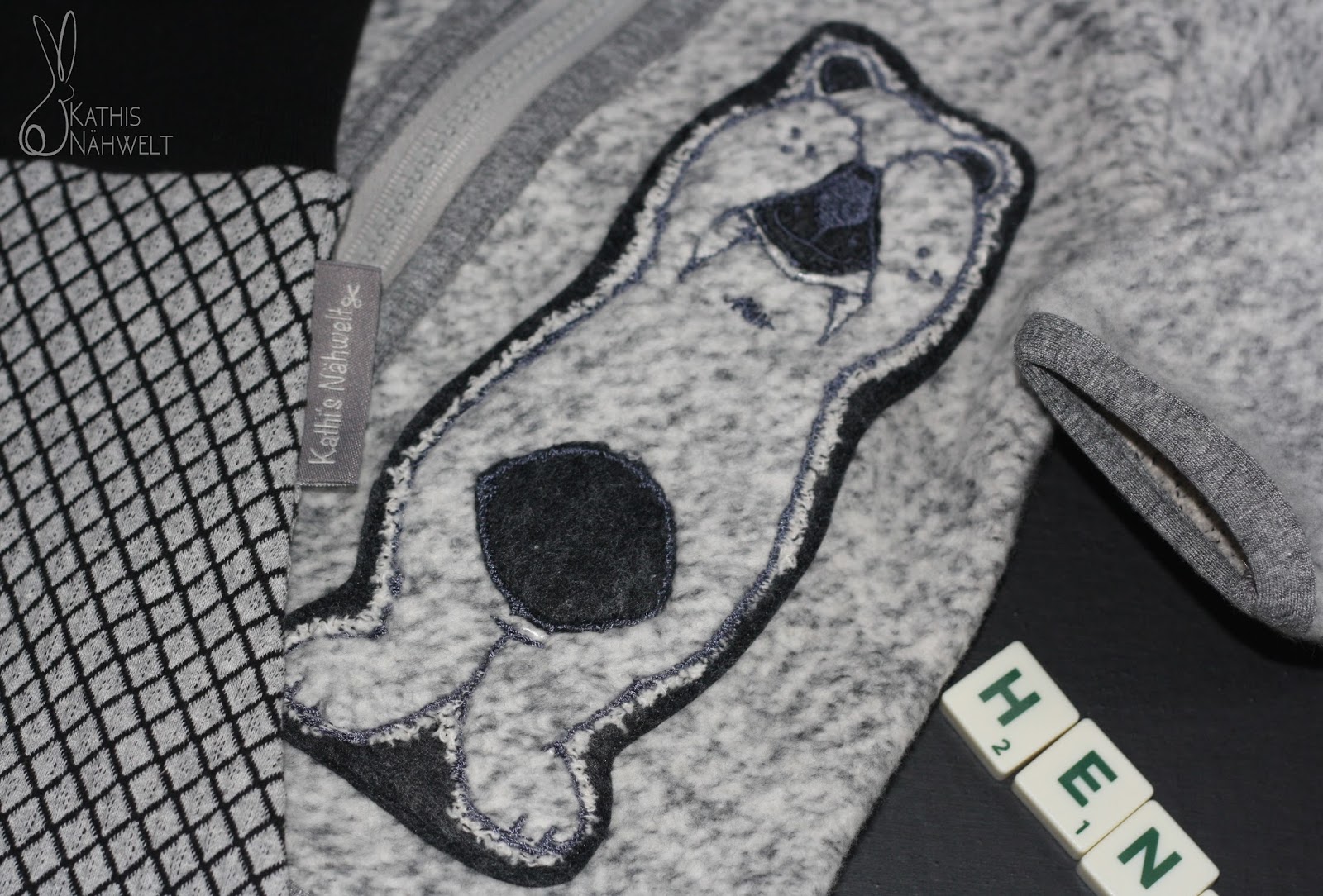 Für die Ausflüge gab es eine kleine Jacke (sind Babys echt so klein? Ich kann es kaum fassen), bestickt mit Henning. Henning der Bär hat es mir ja eh schon länger angetan. Der muntere Geselle stammt aus der Feder von Lila-Lotta und ist jetzt auch als Stickdatei verfügbar. Ich habe jeweils auf Filz gestickt und dann aufgenäht. Als Applikationsstoff habe ich immer den Hauptstoff genommen und teilweise mit Vorder- und Rückseite gespielt. Damit die Stickereien auch zu sehen sind, habe ich diese praktische Folie mit eingespannt. Da passiert dann nichts.